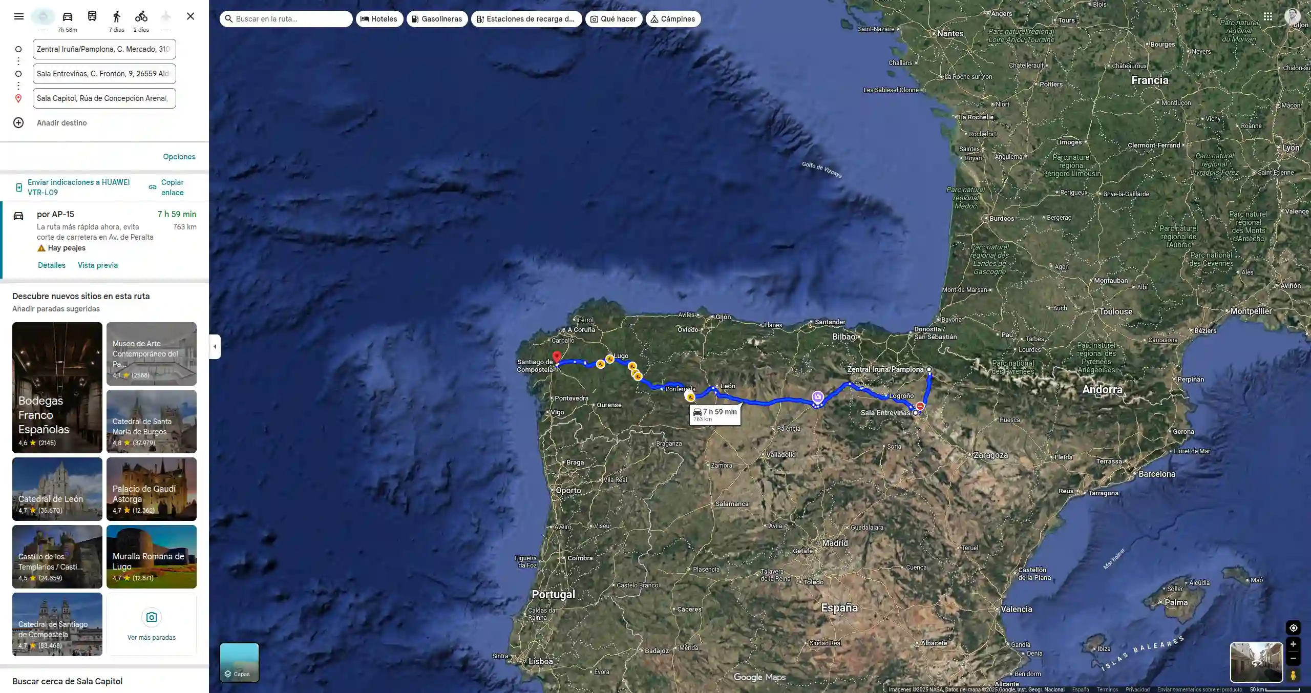 El panel de opciones ofrece una visualización optimizada del itinerario, calculando distancias y secuencias, con integración directa con Google Maps y opciones de exportación en formatos estándar como PDF y KML.
